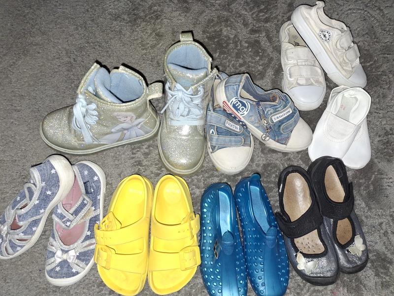 Всі капчики без дифекту,стан хороший.Жовті 26р,(100грн.)чешки 15р(60грн)пляжні чи для басейну голубі в дирочки28р(150грн)з срібним метеликом для садочка 27р(100грн)білі кеди джинс 28р(120грн)джинсові кеди27р(150грн(ботінки ,,Фрозен"Дісней,оригінал з коробкою 28р(700грн)джинсові тапулі для садочка з бантиком28р(100грн)