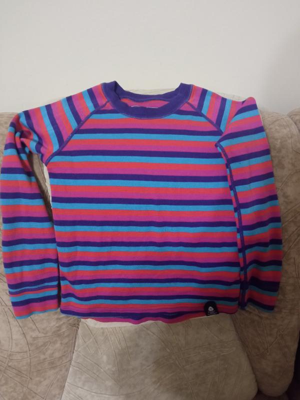 Якісна термокофта з мериносової вовни англійської марки в ідеальному стані. Відмінна поддева як натільного шару під термоодяг. Мериносова вовна прекрасно гріє, вбирає вологу, залишаючись при цьому сухою і продовжує гріти, навіть намокнувши. Такий одяг надягають безпосередньо на тіло, вона м'яка і ніжна, зовсім не дратує шкіру дитини склад: 70% меріно вовна 30% поліестер колір дівчаткам смужки з рожевим розмір: 7-8р довжина 44см, рукав+плече 52см
