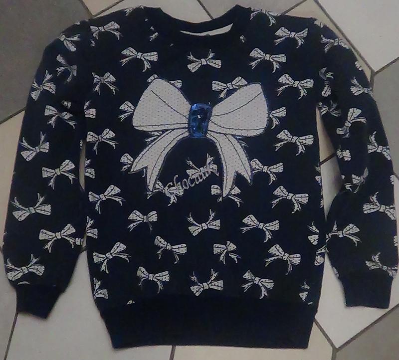 Продам батник для девочки "бантики". Мягкий натуральный трикотаж, манжеты не растянуты, дефектов нет. Замеры длина 44 см, ширина по 30 плечам см, длина рукава 42 см, ширина подмышками 33*2 см.