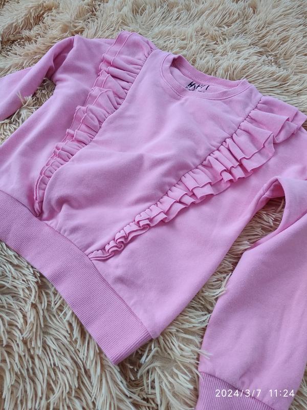 Красивая толстовка для девочки в идеальном состоянии. Приятная натуральная ткань. Цвет как на фото с бирками. Длинна 44 см, рукав от горловины 56 см, ОГ 43 см.