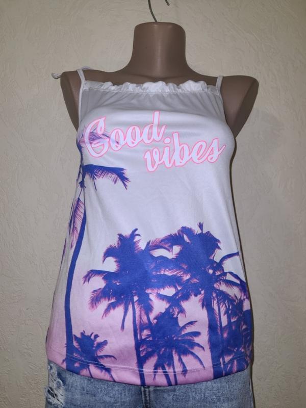 Топ маєчка, білого кольору на тонких бретелях, з принтом пальми, та яскравим написом. Вимірювання на фото