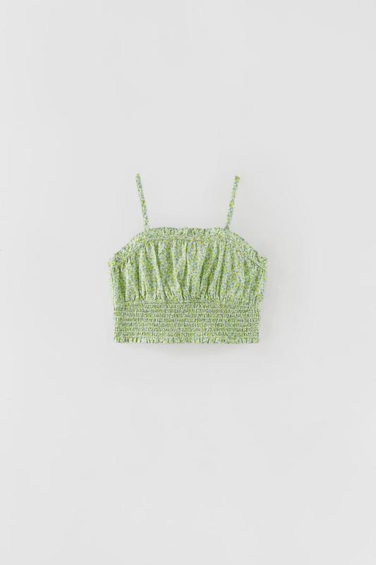 ТОП С ЦВЕТОЧНЫМ ПРИНТОМ И ПРИСБОРЕННОЙ ДЕТАЛЬЮ Топ с квадратным вырезом и бретелями. Присборенная деталь снизу, сборки. ЛАЙМОВЫЙ | 8574/638