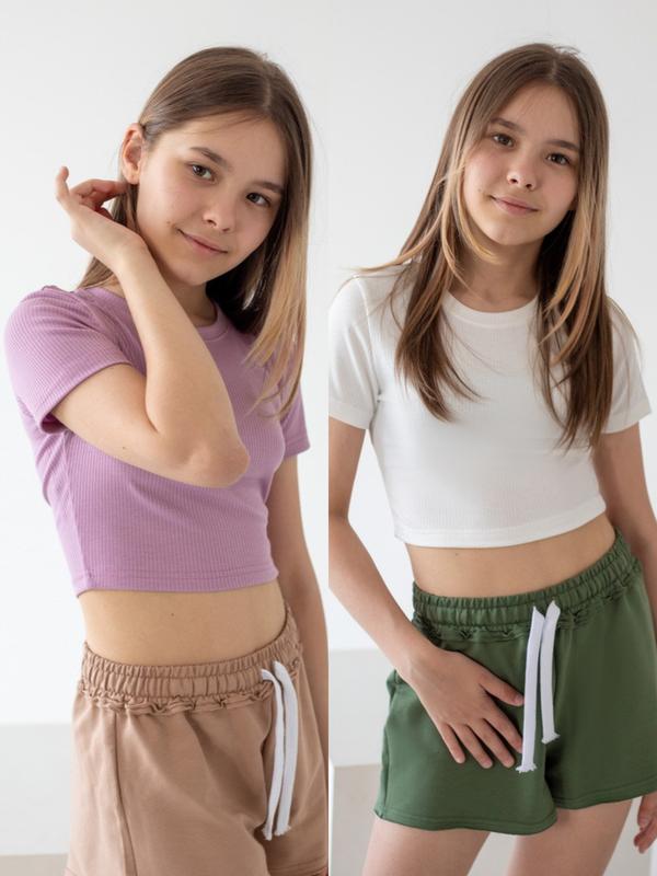 Через Шафу відправок немає❗ Базовий кроп-топ для дівчат-підлітків з легкого полівіскону. Модель прилеглого силуету з короткими рукавами, округлим вирізом, виконана в двох кольорах - молочний та бузковий. Топ відмінно доповнюється будь-якими джинсами з високою посадкою, штанами, шортами і спідницями. Полотно високої якості, завдяки фактурі "рубчик" досить еластичне, добре облягає фігуру. Полотно: полівіскон Склад: 50% віскоза, 45% поліестер, 5% еластан Поради щодо догляду: прати при температурі не більше 30°C. Допускається прання в режимі "ручне" або "делікатне".