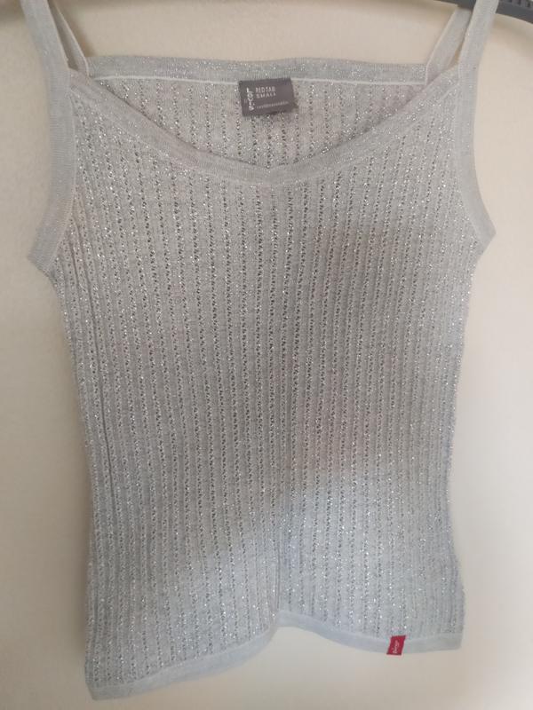 Срібний топ, оригінал, бавовна та металізована срібна нитка. Буква Д викладена стразами ззаду майки. ширина під рукавами 36, тягнеться до 42 ширина в талії 32, тягнеться до 39 ширина внизу 36, тягнеться до 39 довжина 44 по спинці ідеальний стан, одягалася підлітком пару разів.