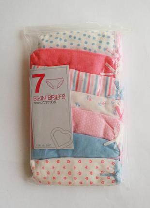 Продаются поштучно* и упаковкой. Маломерят!Цена со скидкой указана за 1 трусики. Трусики для девочки Primark, модель бикини, в комплекте 7 шт. разного цвета. При покупке поштучно трусики будут без бирки и упаковки. Без торга. Задавайте вопросы до оформления и оплаты заказа. Нижнее белье обмену и возврату не подлежит! 100% оплата на карту Приватбанка или наложенный платеж Новой почтой по предоплате. Возможна оплата наличными при самовывозе. Доставка: Новая почта день в день - если заказ оплачен до 12-00. Укрпочта по вторникам и четвергам - если заказ оплачен до 9-00. Воскресенье выходной.