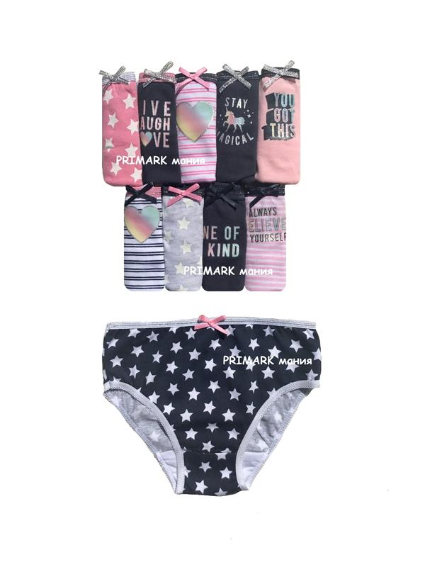 Primark Трусики для дівчинки з принтами 10 шт. в упаковці Розміри: 98 см (2-3 роки), 110 см (4-5 років), 116 см (5-6 років), 122 см (6-7 років) Склад: 9 шт. 100% бавовна 1 шт. 60% бавовна, 40% поліестер Майки з останнього фото продаються окремо. В упаковці трусики можуть трохи відрізнятися за вимірами, т.к. розраховані на два роки носіння дитиною Нижня білизна обміну та поверненню не підлягає. Робіть вибір обдумано Весь асортимент трусиків для дівчаток https://shafa.ua/member/primark_mania/clothes?category=147