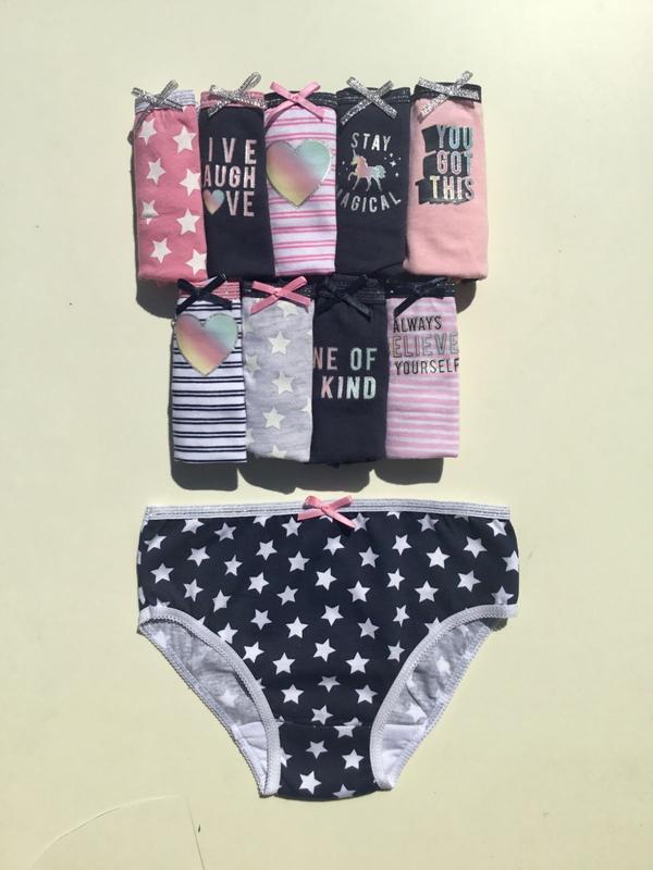Трусики для дівчинки з принтами 10 шт. в упаковці Розміри: 98 см (2-3 роки), 104 см (3-4 роки), 110 см (4-5 років), 116 см (5-6 років), 122 см (6-7 років), 152 см ( 11-12 років) Склад: 9 шт. 100% бавовна 1 шт. 60% бавовна, 40% поліестер Доставка: Нова пошта: по суботам. Умови оплати: *По повній передоплаті на карту *По передоплаті 200 грн, решта накладеним платежем. Обміну та повернення немає.
