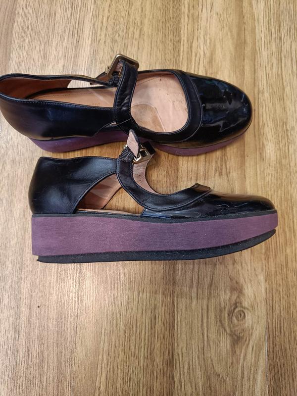 Туфлі для дівчинки модні, легкі, виробництво Франції, натуральна шкіра. Довжина устілки — 23 см, висота платформи — 5 см ззаду й 3 см спереду. На ніжці мають дуже красивий вигляд.