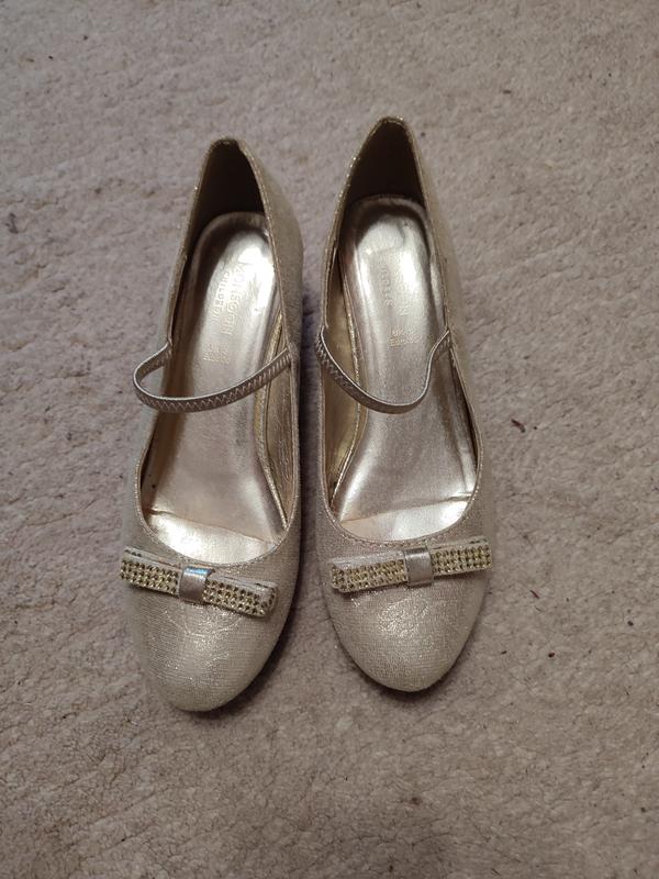 Золотые нарядные туфельки с красивым бантиком. Длина стельки 23см, высота кольца 4см. Ответим на ваши вопросы.
