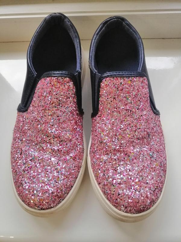 Блискучі мокасини для дівчинки. Підійдуть на високий підйом ніжки. Довжина устілки 21 см. Є дефект, видно на останньому фото.