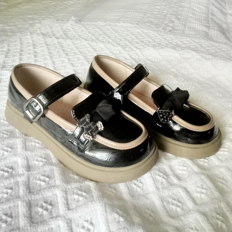 Туфельки для дівчинки. Стан майже новий. одягали декілька раз. Є один недолік , загублена деталька ведмедика все видно на фото. Розмір 33 , стєлька не витягується замір по підошві 24,5 см. Колір чорний із вставками беж.