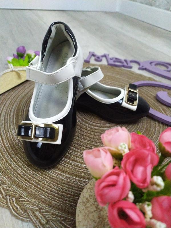 Детские туфли kellaifeng для девочки кожаные лак черные с белым размеры 23, 26