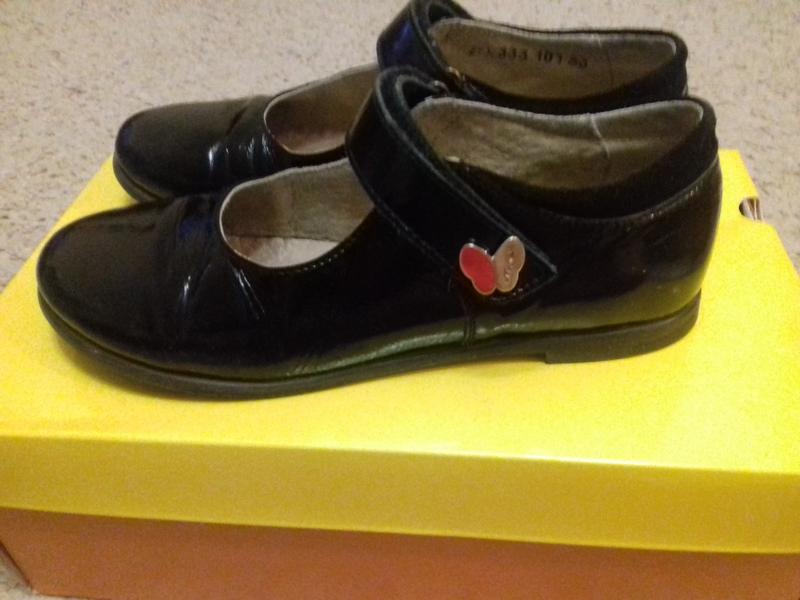 Кожаные туфли для девочки (производство Украина, Мальвы), размер 33. Кожа глянцевая. Подходят на среднюю полноту. На узкой ножке могут болтаться.