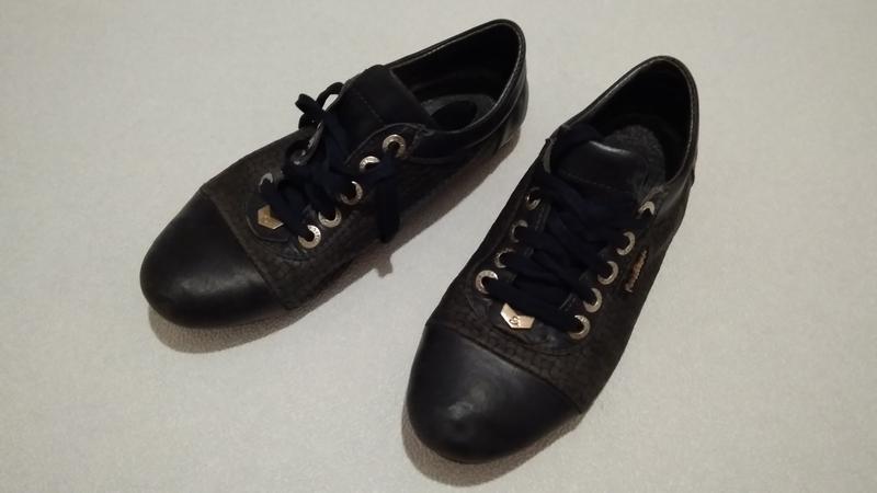 Туфлі повністю шкіра, по устілці 23 см, розмір 37, темно-сині. Нюанс: на правому каблуці відпала наполовину золотиста смужка.