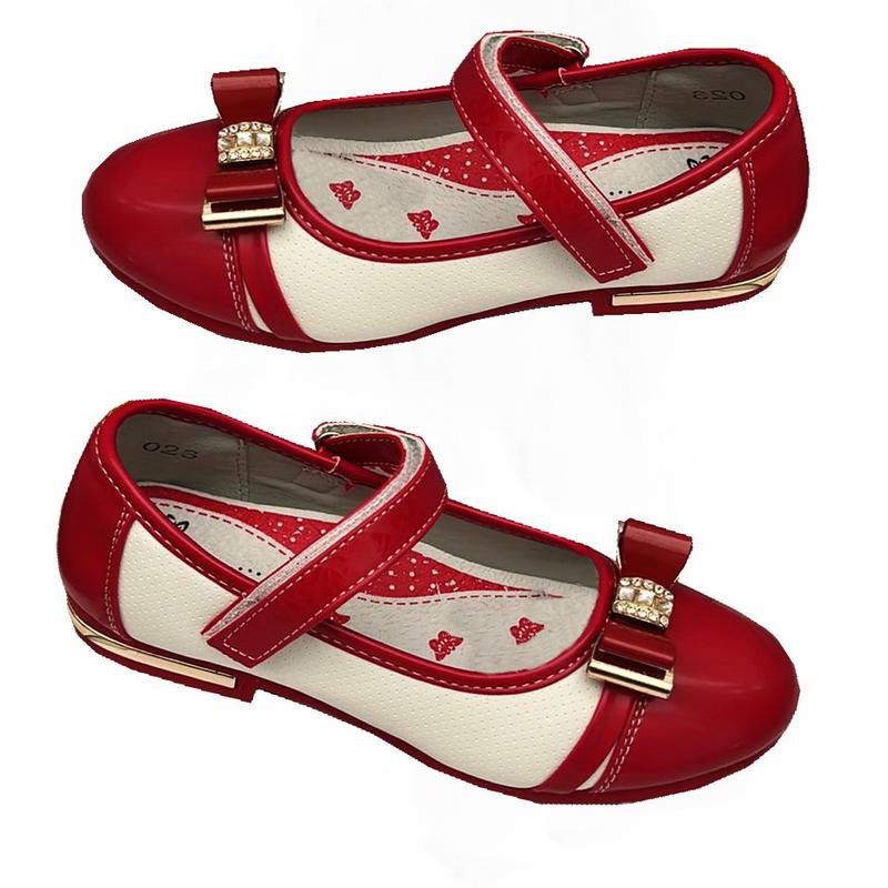 красиві туфельки з елегантним бантиком, він прикрашений стразами та металевими золотистими вставками, каблук також прикрашений металевою окантовкою, на ніжці фіксується перетинкою на липучці, анатомічна устілка з супінатором і перфорацією - натуральна шкіра, якісне виконання, туфлі виготовлені зі шкірозамінника, розміри 31-36