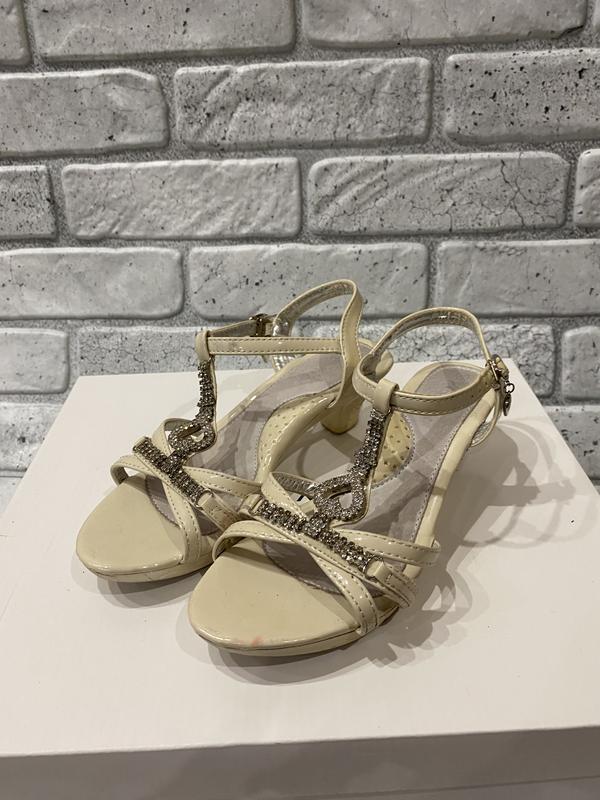 Туфли для девочки на кольца Молочного цвета Имеют регулирующую застежку Эффекты: царапины, отсутствие нескольких камешков Размер: 35