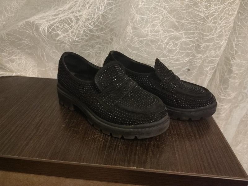 гарні туфлі лофери.стан добрий,передала на фото,яких то нюансів немає але туфли були у користуванні.якість дуже гарна,стрази не відклеюються,натур.замша а в середнни шкіра.розмір 31 (19см)