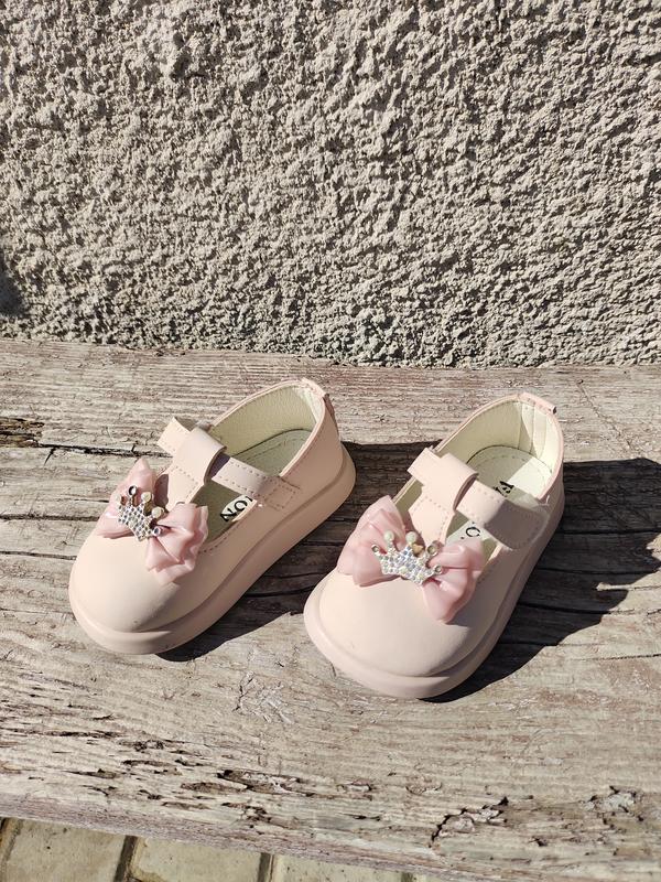 туфлі на дівчинку, надзвичайно м'ягкі і зручні, майже без нюансів, єдине що на брошках не вистачає бусинок, але при бажанні можна приклеїти(вони такі і приїхали нові) і чуть поцарапаний носок на лівій туфельці, липучки робочі, з ніжки не злітають розмір 19, по стельці 13.5 см
