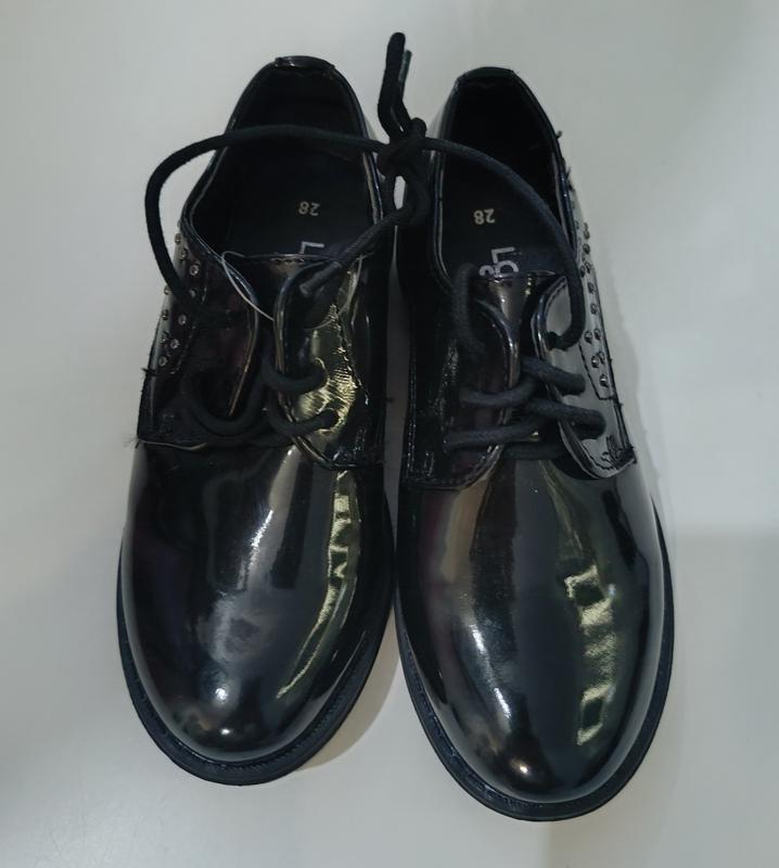 Дитячі чорні лаковані туфлі з декорацією. Верх виконаний зі штучного лакованого матеріалу. Взуття має чорні шнурки та підошву. Підходить для святкових або офіційних подій.