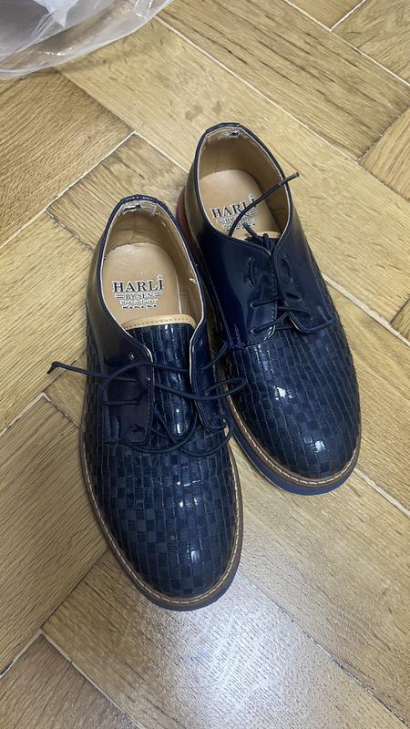 Лакові туфлі, темно синього кольору. Шнуровка-резинка. Зовні охайні, в середині є дефект. (На фото видно)