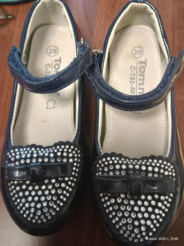 Туфельки "под лак" темно-синего цвета, несколько раз одевались.Перед выложен камушками. Длина стельки 18 см.