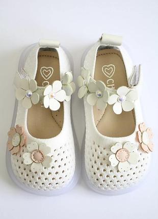 Легкі туфлі для дівчинки. Пошиті з ажурного текстилю. Підошва рівна, з невеликим підйомом. Прикрашена LED підсвіткою. Всередині еко устілка. Для хорошої фіксації є ремінець. Додатковий декор - світлі квіточки спереду та на ремінці.