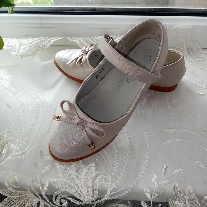 Чудові туфельки. Легенькі та зручні. Можна на свято і на кожен день. Устілка шкіра, верх текстиль. З нюансів є плямки тускліші за загальний фон, але туфлі такими і купували я, можливо так і треба. І ще загубилася прикраса на останньому бантик у, можу покласти інші, можна прикріпити.