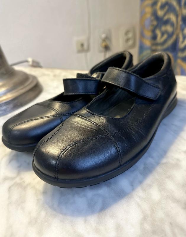 Зручні туфлі для дівчинки бренду Gorila (Іспанія). Вони виготовлені з натуральної шкіри, чорного кольору. Мають застібку на липучці, що зручно для дитини. Підошва м’яка, гнучка, з ортопедичним ефектом (технологія Adaptation), добре підтримує стопу. Підходять для школи або щоденного носіння. Стан — дуже гарний, майже не ношені.