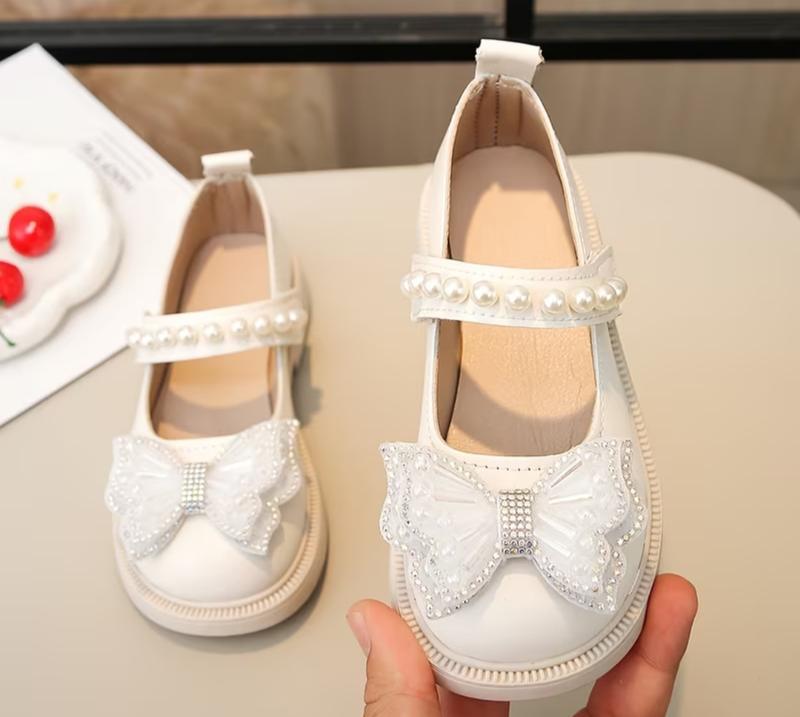 Дівочі блискучі туфлі зі стразами, перлинами та бантом – амортизуюча підошва, дихаючі, ремінець із пряжкою – м’які туфлі з круглим носком для школи, танців, повсякденного вбрання Розмір 21-14 см