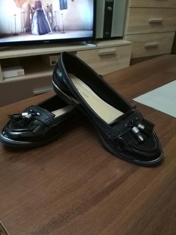 Состояние отличное, дефектов нет, черного цвета, лаковые. На ноге очень нарядно смотрятся. Для школы в самый раз. Стелька 23,5 см. Ширина стандартная. Будут вопросы пишите, дополнительные фотографии предоставлю. Оплата на карту ПриватБанка, возврата нет
