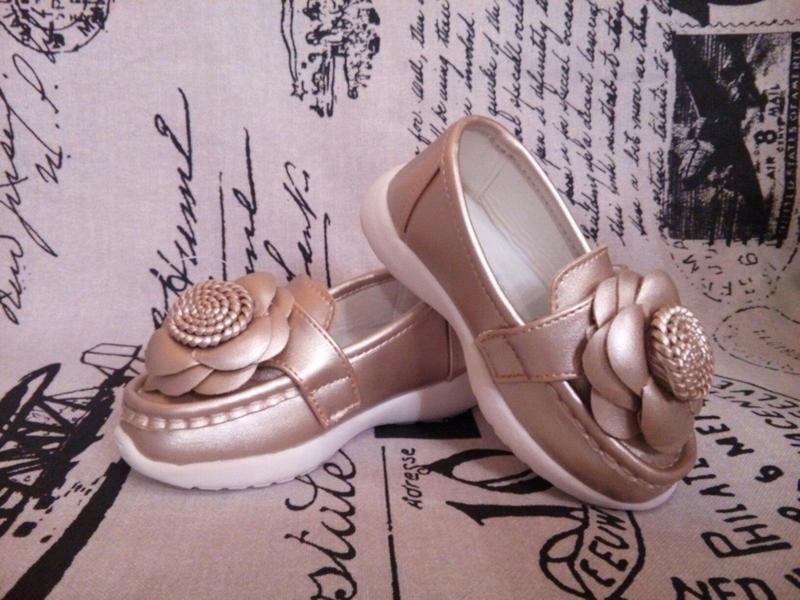 Туфли золотистого цвета. размеры 23 - 14 см. и 24 - 14,5 см. (замеры сделаны рулеткой вручную). Очень красивые, нарядные. липучка
