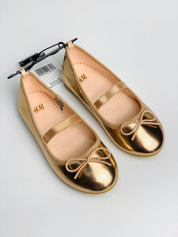 Відмінні балетки дівчинці від H&M. Чудове європейську якість і стильний дизайн взуття. Балетки золотого кольору на резинці спереду! Підкладка та устілка з 100% бавовняного полотна. Рифлена гумова підошва. Неймовірно легкі і зручні балетки для дівчинки! Розміри в наявності: 33 устілка 20, cm Вся взуття бренду H&m полномерка!