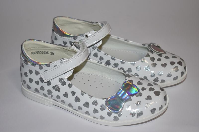 Білі туфельки з сріблястими сердечками фірми Weestep. Верх - штучний лак. Всередині - натуральна шкіра, устілка з супінатором. Розмір 25-30. Довжина устілки: 25-16,3 см 26-17 см 27 - продано 28- продано 29 - продано 30- продано