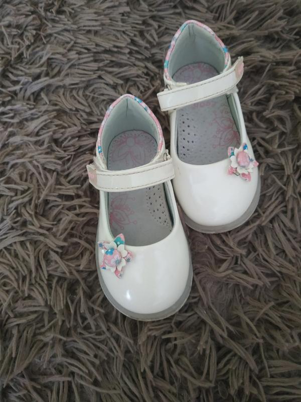 Туфельки - 22 розміру, є один невеличкий дефект(на 3 фото) , не помітний при носці. Шкіряна устілка і супінатор