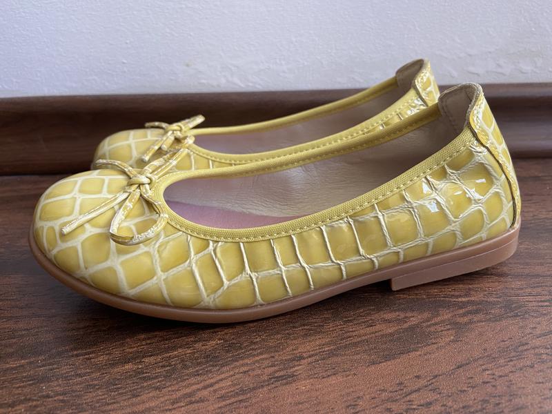 Нові шкіряні туфлі, балетки Pablosky(Spain)з м'якою структурної лакової шкіри, під рептилію жовтого кольору з лаймовим подтоном,розмірна сітка на сайті 20.6 см на маленькому каблучку 1-1.5 см, устілка -також шкіра,еластичні краї для зручності,оч.легкі