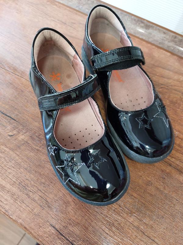 Натур.лакированная кожа, прекрасные туфельки для девочки. идеально сменная обувь в школу. есть небольшой дефект на последнем фото. длина стельки 20.5 см.