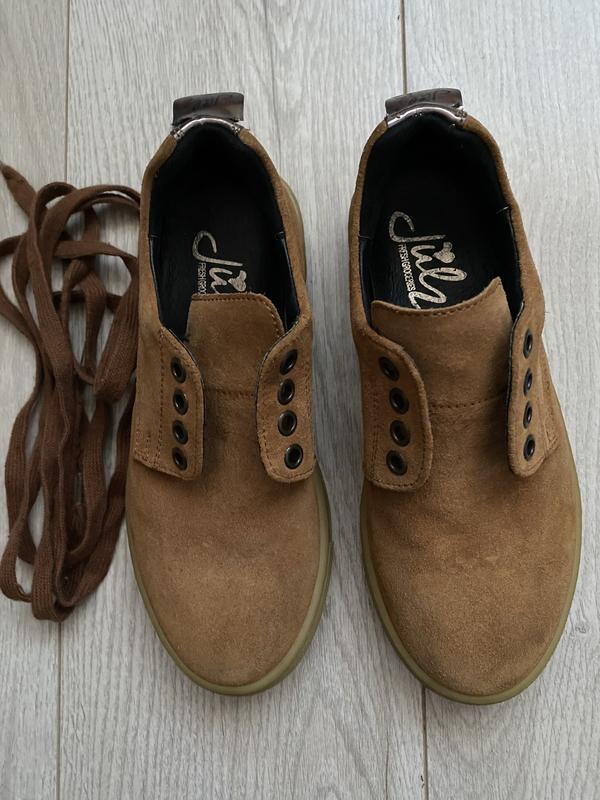 Черевики замшеві рижого кольору,підійдуть і дівчинці і хлопчика Фото на тілі нема Застібається на шнурки Розмір за фактом 29-30 Підійде на вузькі середні ніжки Устілка 17 см) Висота 6 см) Ширина підошви 8 см) З нюансів місцями видно незначні сліди носіння,забруднення,та тверді десь 5-10%,тому ціна нижче,продається без повернення.