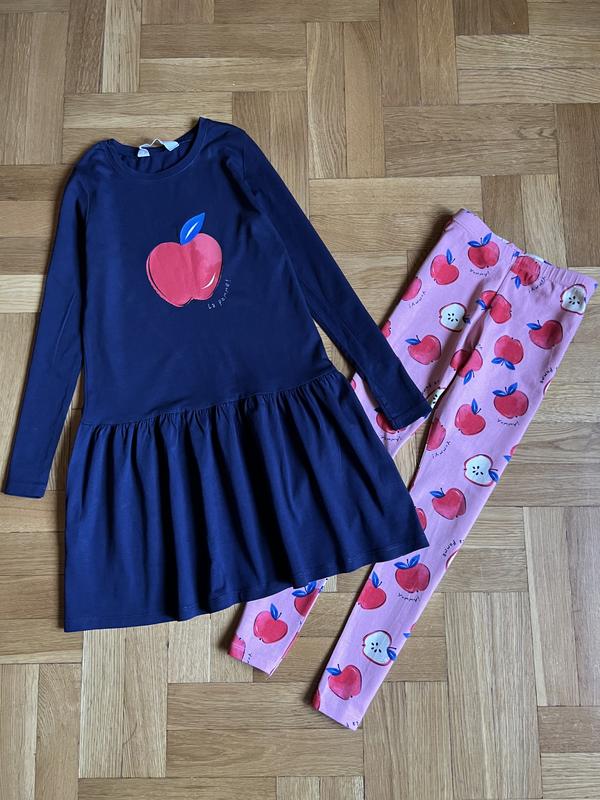 Гарний набір H&M. Плаття-туніка нове, не вдягалось, лосіни в дуже гарному стані, без нюансів. Розмір 7-8 років, плаття, пог 34 см, довжина 70 см, рукав від плеча 49 см; лосіни, пот 27 см, довжина 69,5 см, крок 53 см.