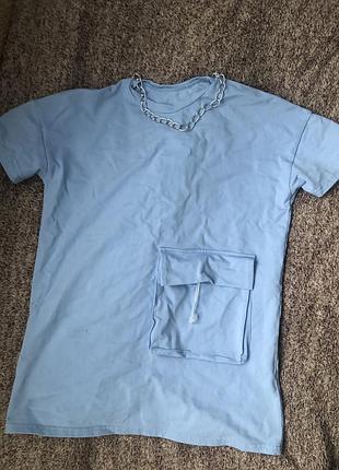 Цікава туніка для дівчинки 9-10 років. Оверсайс . Має срібний ланцюжок та карман. Насичений блакитний колір.