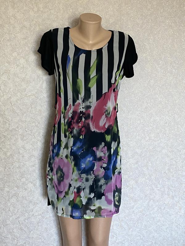 Туніка віскоза з принтом нова Артикул 11088 Разміри вказані європейські на наші +6 Розмір вказаний 42 Обхват грудей ПОГ - 44 Обхват талії ПОТ - вілно Обхват стегон ПОБ -вільно. Довжина 87 95% віскоза, 5% еластан Ця легка туніка з розкішним принтом— справжнє втілення жіночності й легкості