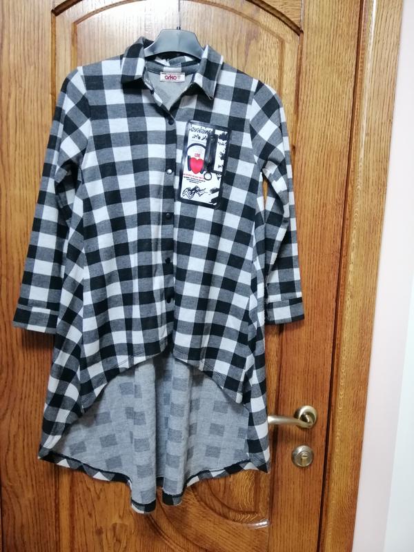 детская туника на кнопках.Размер 140. Обладает интересным дизайном.Размеры: плечи 33см, рукав 50см, длина перед 57, длина сзади 90см.Материал 95% хлопок,5% эластан.Тонкий трикотаж.Турция производитель.