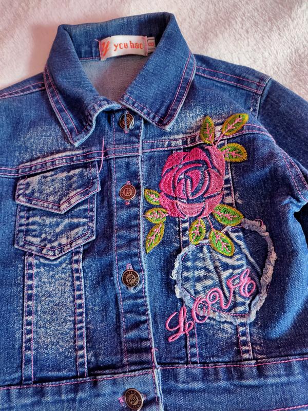 Стрейчевая,джинсовая куртка для девочки,3-4лет. В очень хорошем состоянии. Цветы вышиты. Длина-31 ПОГ-30 Рукав-31