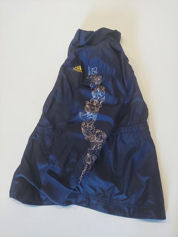 Оригинальная куртка, ветровка Adidas clima prof синего цвета. Состояние очень хорошее. Было бы идеальное если бы не нюанс, на внутренней стороне рукава ребенок сделал зацепку. На послелюднем фото указала. Других нюансов нет, все отлично. На бирке 11-12 лет, можно одевать с 10-12 лет. Произведена в Камбоджи. Замеры по запросу. Внутри подкладка сетка. Подклад в идеальном состоянии. Мандеты регулируются, подкатываются как вам нужно. На левом рукаве апликация с цветочным принтом.