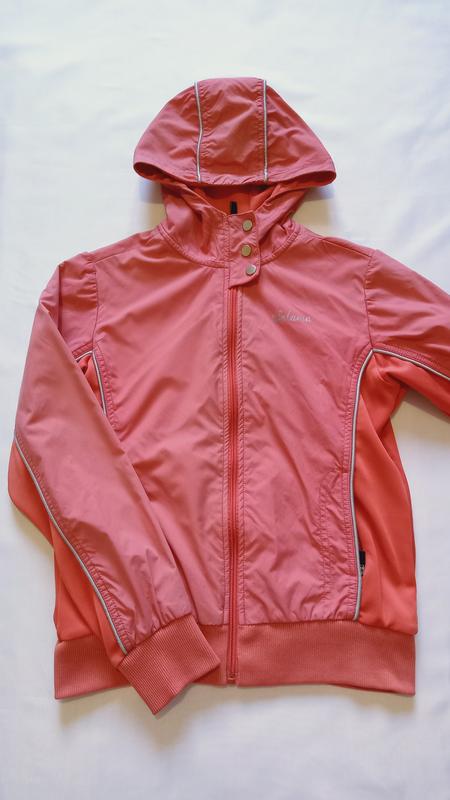 Вітровка з рожевої плащівки з трикотажними вставками з боків морквяного кольору Довжина по лінії грудей 50 см ПЗ по лінії грудей 42 см Ширина спини від плеча до плеча 35 см Довжина рукава 53 см Розмір на 9-10 років Стан дуже гарний, немає однієї кнопки (останнє фото) З усіх питань звертайтеся