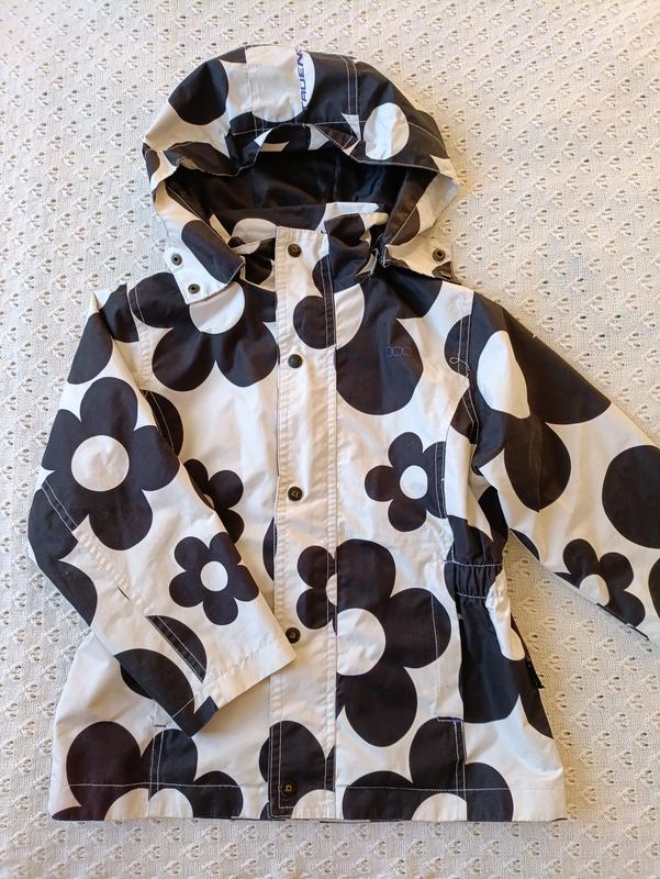 Курточка вітрівка для дівчинки бренду True north в дуже хорошому стані. Лише на одній кишені є кілька малесеньких проколів, показано на фото, у вжитку непомітно. Розмір вказаний 104 см, може бути довше. Тканина - плащівка, захищає від вітру і вологи. Висока горловина. Защіпається на блискавку і кнопки. Глибокий капюшон, на кнопках. Є дві кишені, які закриваються на блискавки. Красивий чорно-білий квітковий принт. Гарно виглядає на дитині. Довжина 47, рукав від плеча 39,5, ширина під рукавами 40, в поясі 35 см. Дивіться також інші мої оголошення.