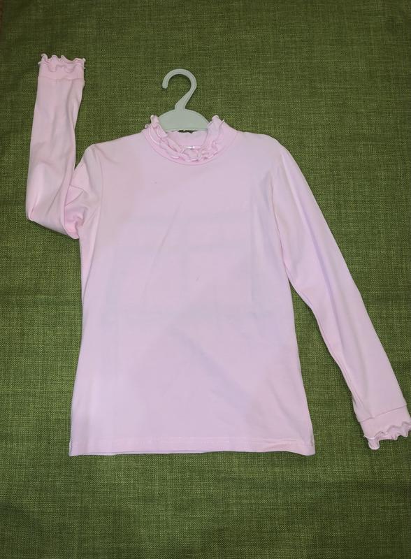 Гольф на девочку С рюшами на горловине и по низу рукава Размер: 140 Тканина: 95% бавовна; 5% еластан Цвет: розовый