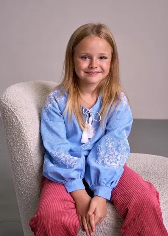 Блуза вышивка детская "Звезда" изготовлена из нежно-синего габардина. Модель украшена утонченным белым геометрическим орнаментом и изящными завязками. Размеры от 116 пор 158 по росту под заказ Тканина ― габардин нольделяттричетырешим-симтришнул восемью
