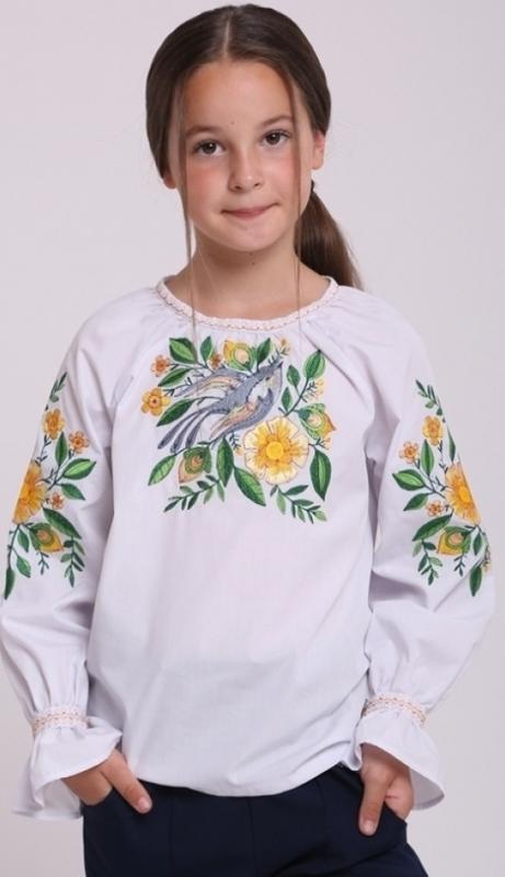 Стильна вишиванка для дівчинки з вишивкою передній частині сорочки і рукавах. Горловина зібрана в рюш тонкою стрічкою. Дану сорочку можна носити як під штани так і під спідницю.