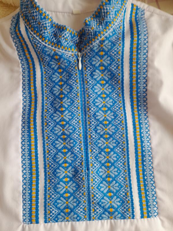 вишиванка на хлопчика стан чудовий, лише коло маншета легка пляма від фарби, ледь помітна, це враховано на вартість. вишивка машинна. довж 55 пог44 рукав 52 плечі38