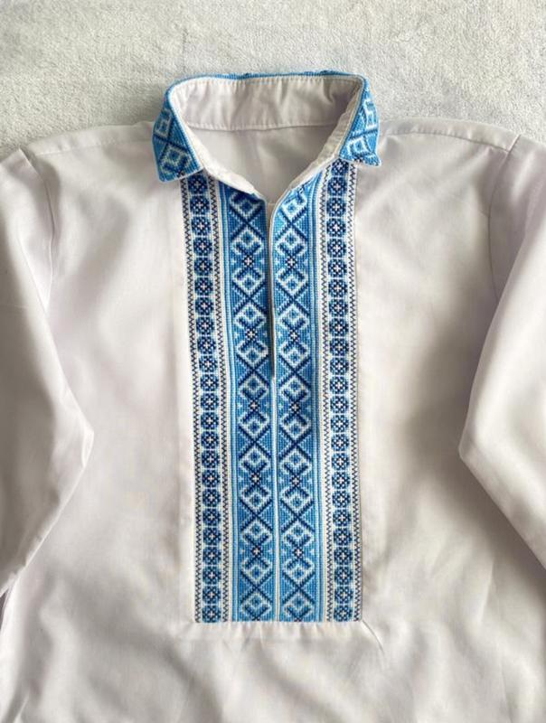 Вишиванка на хлопчика, дуже гарна. Може підійти на дитину від 2 до 4 років залежно від комплексів. Дивіться по розмірах. Є ще червона. Тканина не тягнеться. Довжина - 39.5 см Рукав від плеча -33 см Ширина під ручками - 36 см.